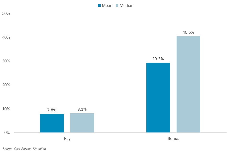 However, in 2020, the statutory gender pay gap methodology was aligned for the first time with Civil Service Statistics; the figures presented below are therefore aligned with the statutory reporting methodology. The median and mean gender pay gap for the Civil Service is 8.1% and 7.8% respectively. The median and mean bonus gap for the Civil service is 40.5% and 29.3% respectively.