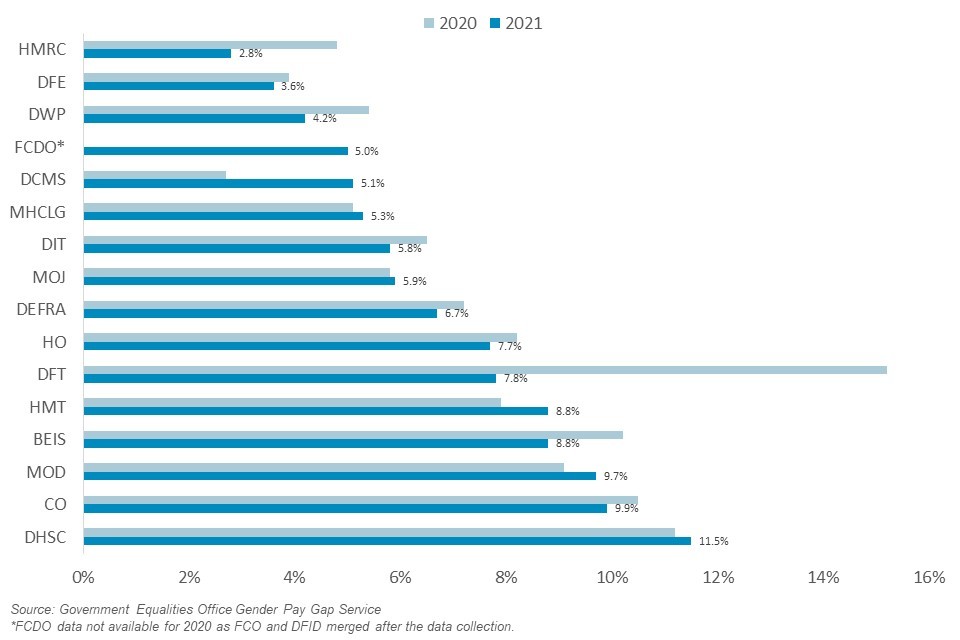 The mean pay gap for 2021 ranges from 11.5% in the Department of Health and Social Care, to 2.8% in HMRC.