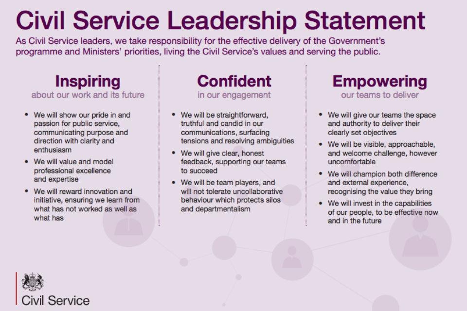 This statement of intent takes as its starting point the responsibility of the Civil Service for the effective delivery of the government’s programme and ministers’ priorities, living its values and serving the public. It highlights the 3 key characteristics that civil servants have indicated they expect from their leaders, and that we expect Civil Service leaders to live up to. They are: