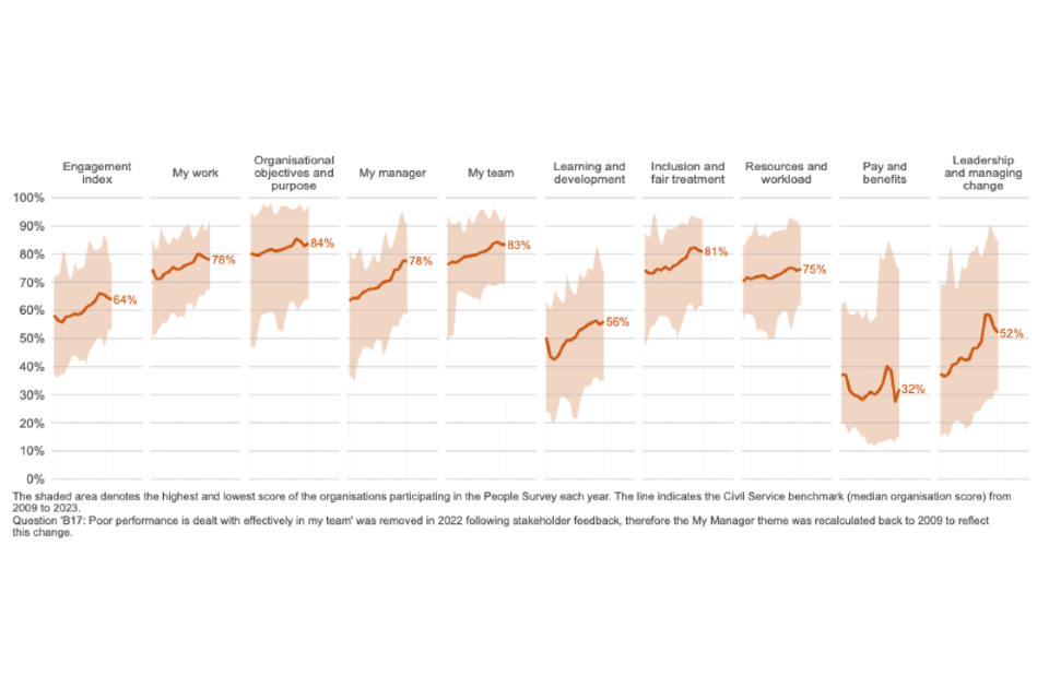 Figure 2: Civil Service People Survey benchmark scores 2009-2023 for Employee Engagement Index and main themes (access Table 2)(ODS, 18KB)