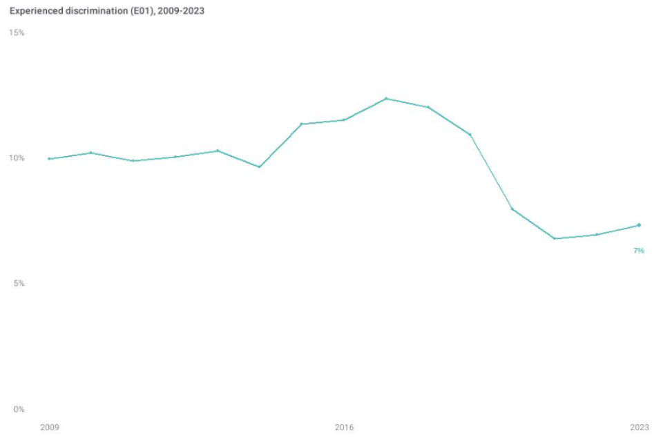 Figure 3: Experienced discrimination trend, 2009 - 2023 (access Table 3)(ODS, 18KB)