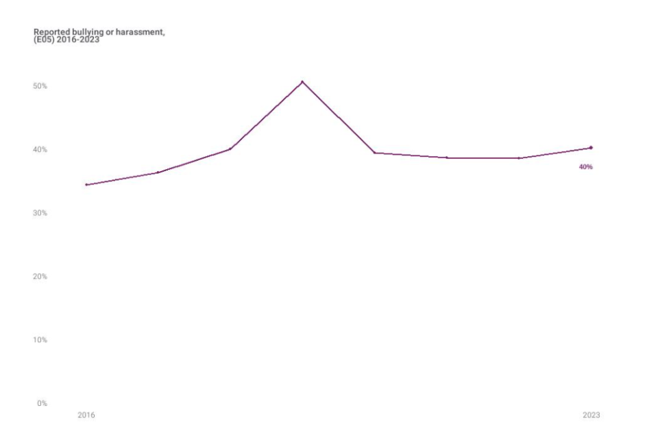 - Bullying/harassment rates remained the same at 7% for Male, 9% for Female colleagues and decreased by 1 percentage point for staff who identify as Other at 17%. The score did not change for Cisgender (8%) but it increased by 3 percentage points for Transgender colleagues (17%).