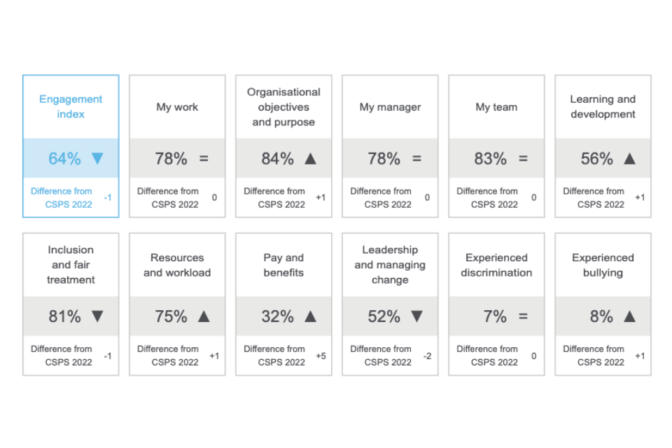 This page is an overview of the headline findings of the 2023 Civil Service People Survey for the purpose of providing commentary to the results. It is composed of five sections: (i) employee engagement and theme scores; (ii) discrimination, bullying and harassment; (iii) employee wellbeing; (iv) modernisation, reform, productivity and efficiency; and (v) future intentions. The published spreadsheets show all core question scores. Further information about the survey is in the complementary Technical Guide, including the full list of participating organisations, development of the questionnaire over time and detail about how the indices are calculated.