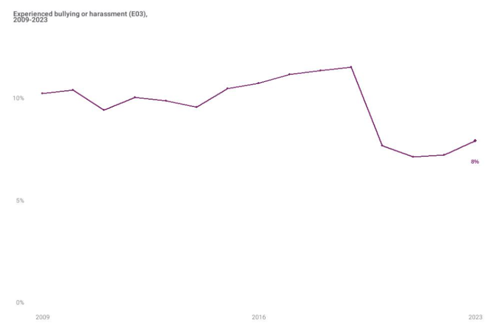 - The level of bullying/harassment did not change based on respondents’ socio-economic background (12% for never worked, 8% for routine and high respectively), with the exception of those in the intermediate category, up by 1 percentage point to 9%.
