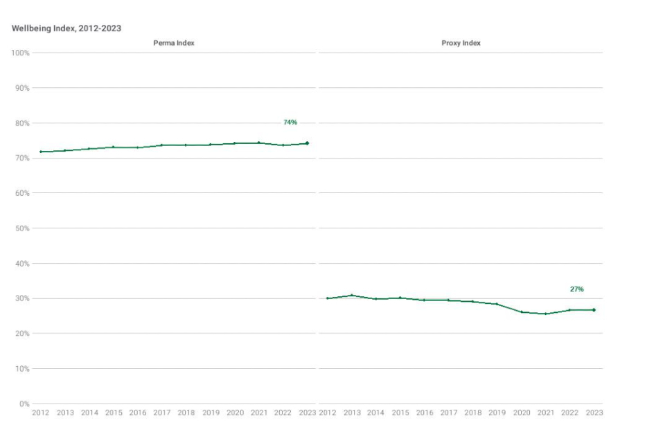 - Considering socio-economic background, the Proxy Stress Index remained the same for all the four categories (27% for high, routine and intermediate, and 29% for never worked). Similarly, the Perma Index was unchanged for all the four socio-economic categories (75% for high, 74% for intermediate and routine, and 72% for never worked).