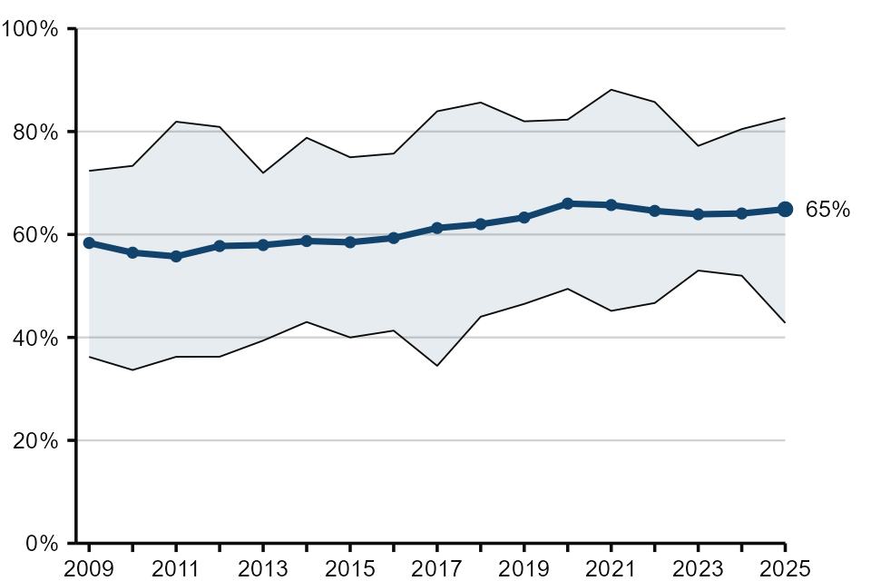 The employee engagement index for the Civil Service was up compared to 2024 at 65%.