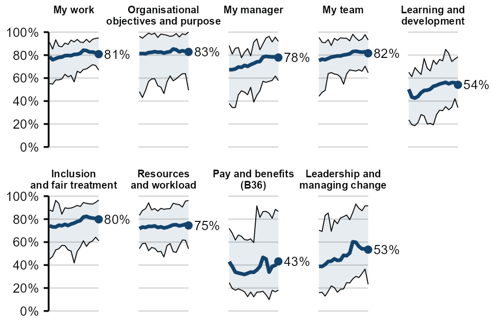 There are nine theme scores derived from the People Survey results, each used to measure a different element of employee experience at work. A theme score is a summary measure for civil servants answering positively (“Strongly agree” or “Agree”) across a similarly themed group of questions. As stated in the note at the top of this report, the themes ‘My work’, ‘My manager’, ‘My team’, ‘Pay and benefits’ and ‘Leadership and managing change’ changed in 2025 and should not be compared with the scores in previous publications.