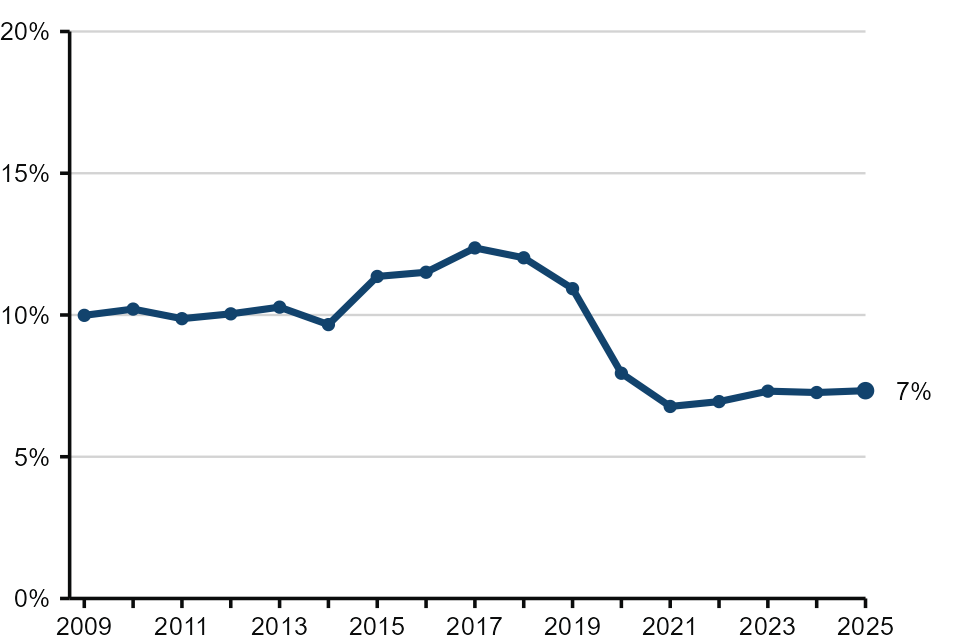 For civil servants who declared they intend to leave their organisation either as soon as possible or within the next 12 months, the most common reasons for doing so were ‘For a better pay and benefit package’ (39%), ‘A promotion or career progression within the Civil Service’ (36%) and ‘For more interesting work’ (30%) (Table 7). Whilst ‘For a better pay and benefit package’ was the most common reason it did see the largest decrease compared to 2024 (down 5pp).