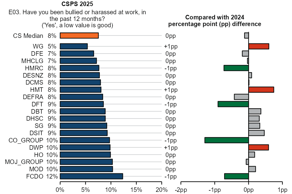 Table 4: 2025 Civil Service median benchmark scores, reporting bullying and harassment (E05A) and the percentage point (pp) change compared to 2024