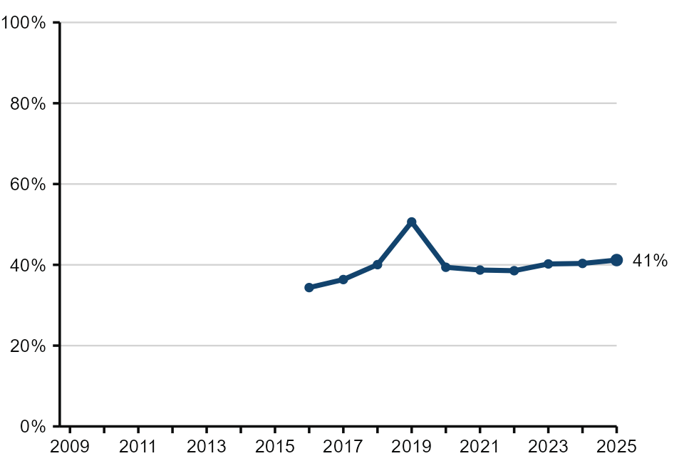 Civil servants who indicated they experienced bullying and / or harassment (‘Yes’ to E03) were further asked ‘Did you report your experience of bullying and harassment?’ (E05). The Civil Service benchmark (median) for staff who said they reported their experienced bullying and / or harassment (41%) was up 1pp when compared to 2024 (Figure 8).