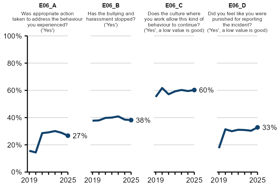 Civil servants who reported their experience of bullying and / or harassment (‘Yes’ to E05) were further asked questions focusing on what happened after.