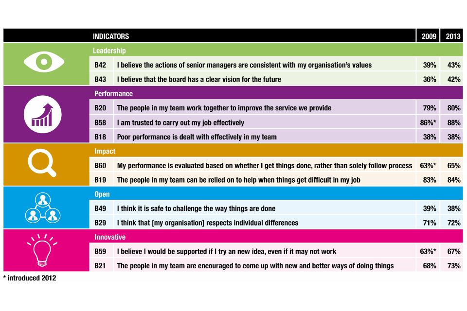 Tackling cultural issues which prevent the Civil Service from providing the very best service to ministers and the public is essential. We have embedded the competency framework but have gone beyond that, seeking the views of hundreds of civil servants on the culture and behaviours that they take pride in and want to retain for the future and the culture and behaviours which are getting in the way of delivering the best for the public and which need to change. Changing culture is a long term task and starts with our leaders – we are now committing to developing a clear leadership statement setting out our expectations of all Civil Service leaders, given effect through our leadership development training and our performance management systems.