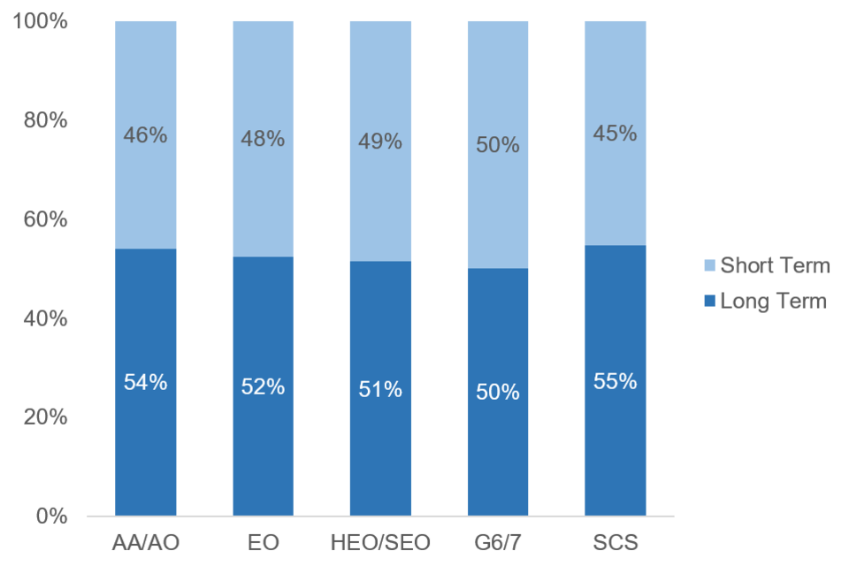 The percentage of days lost to long term sickness absence is broadly similar across grades (between 50% and 55%). The highest is SCS at 55%, and the lowest is G6/7 at 50% of all days lost to sickness.