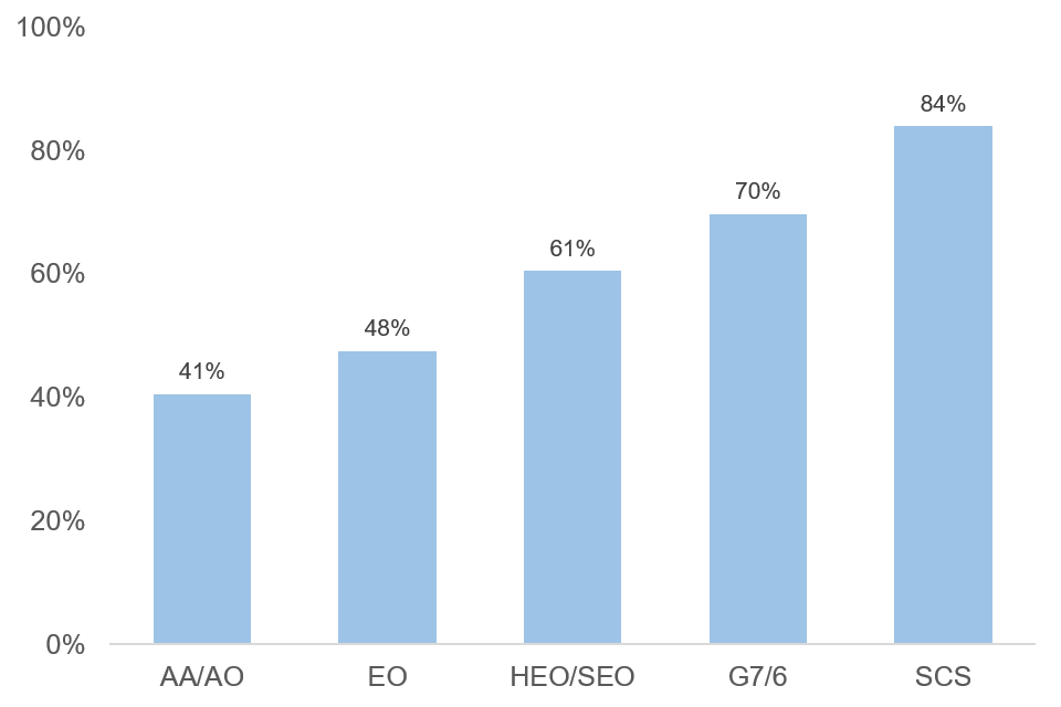 The proportion of staff taking no sickness absence increases with grade, and for SCS is 43 percentage points higher than for AA/AO grades.