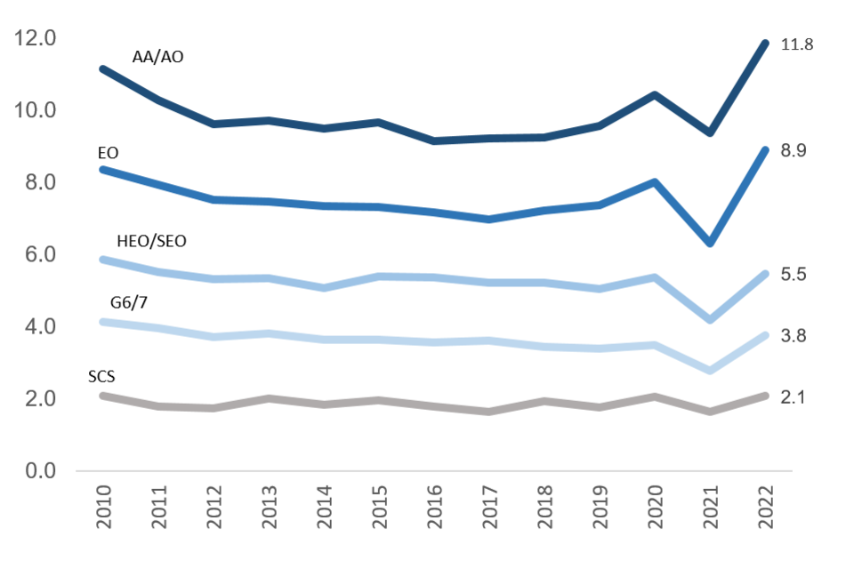 Figure 4.3: Average working days lost per staff year by grade, 2010 to 2022 (see Table 6)