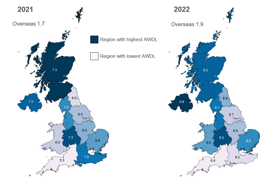 Figure 5.1: Average working days lost per staff year by region for 2021 and 2022 (see Table 7)