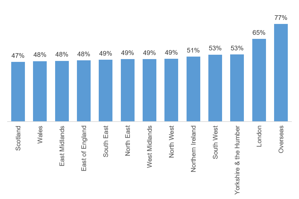 There is also variation in the percentage of staff with no reported sickness absence, after overseas (77%) ranging from 65% in London to 47% in Scotland.