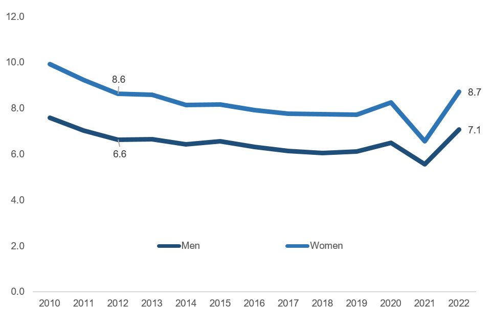 Figure 6.1: Average working days lost per staff year by sex, 2010 to 2022 (see Table 9)