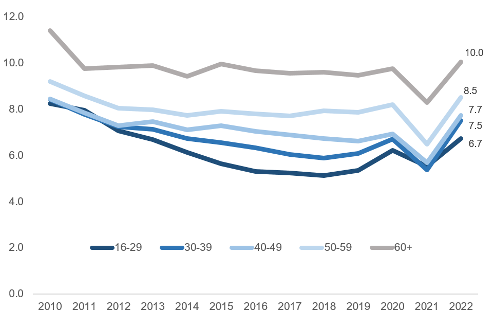 Figure 7.1: Average working days lost per staff year by age, 2010 to 2022 (see Table 12)