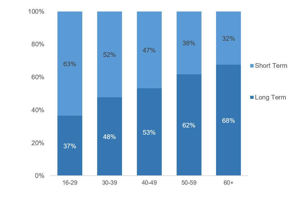 Bar chart showing the percentage of long and short term days lost by age for 2022
