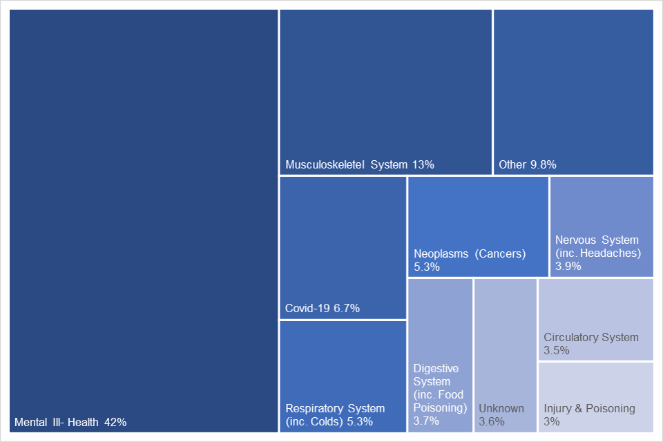 Mental Ill-Health is the largest cause of long term sickness absence (42%), followed by Musculoskeletal System Disorders (13%).