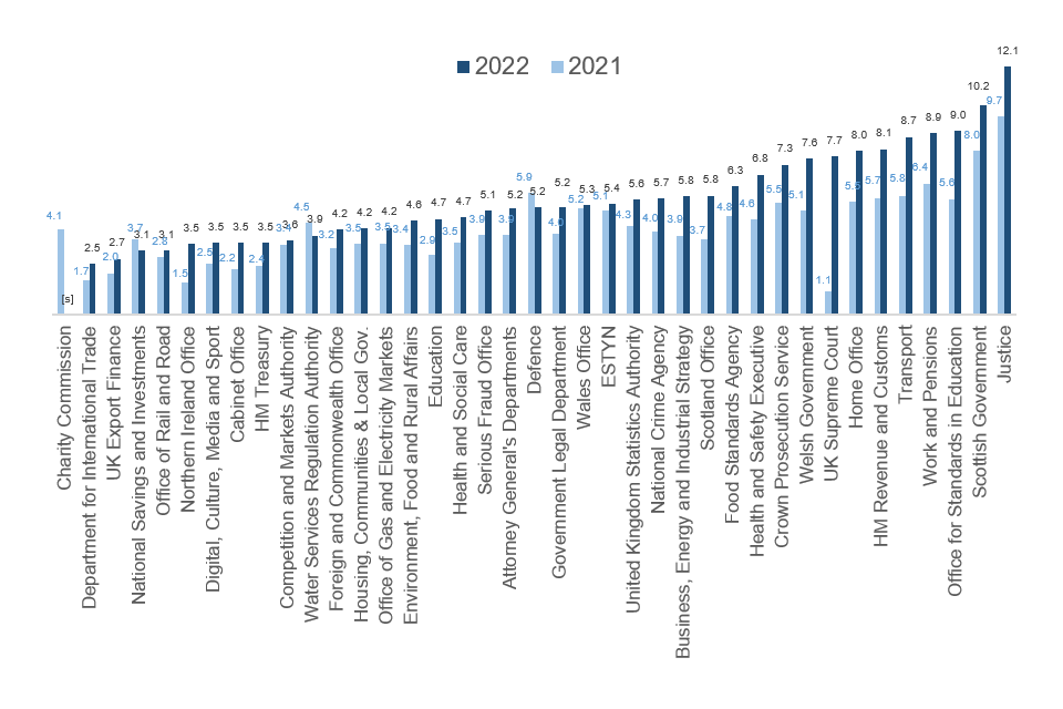 Absence rates differ by department, ranging from 2.5 days at the Department for International Trade to 12.1 days at the Ministry of Justice.