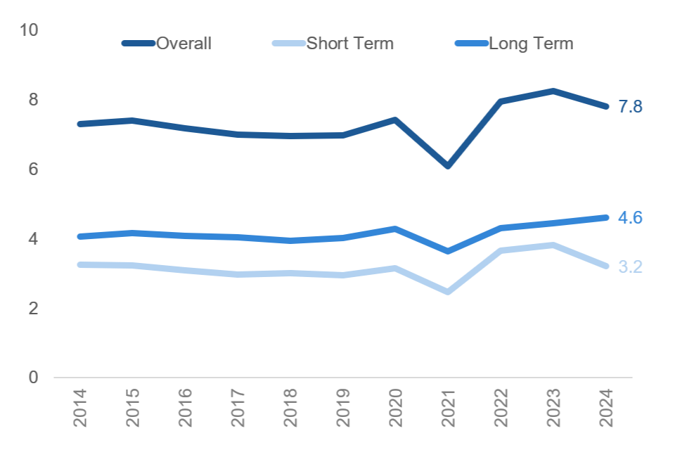 Figure 1.1: Average Working Days Lost per staff year, 2014 to 2024 (see Table 1a)