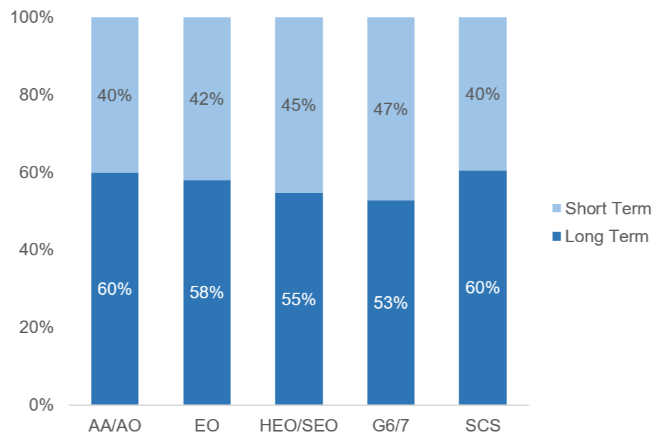 The percentage of days lost to long term sickness absence is broadly similar across grades (between 53% and 60%). The highest is for SCS and AA/AO grades at 60%, and the lowest is for G6/7 grades at 53% of all days lost to long term sickness.