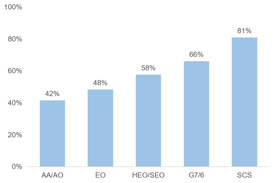 The proportion of staff taking no sickness absence increases with grade, and for SCS is 39 percentage points higher than for AA/AO grades.