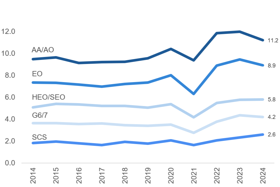 Figure 4.3: Average working days lost per staff year by grade, 2014 to 2024(see Table 6)