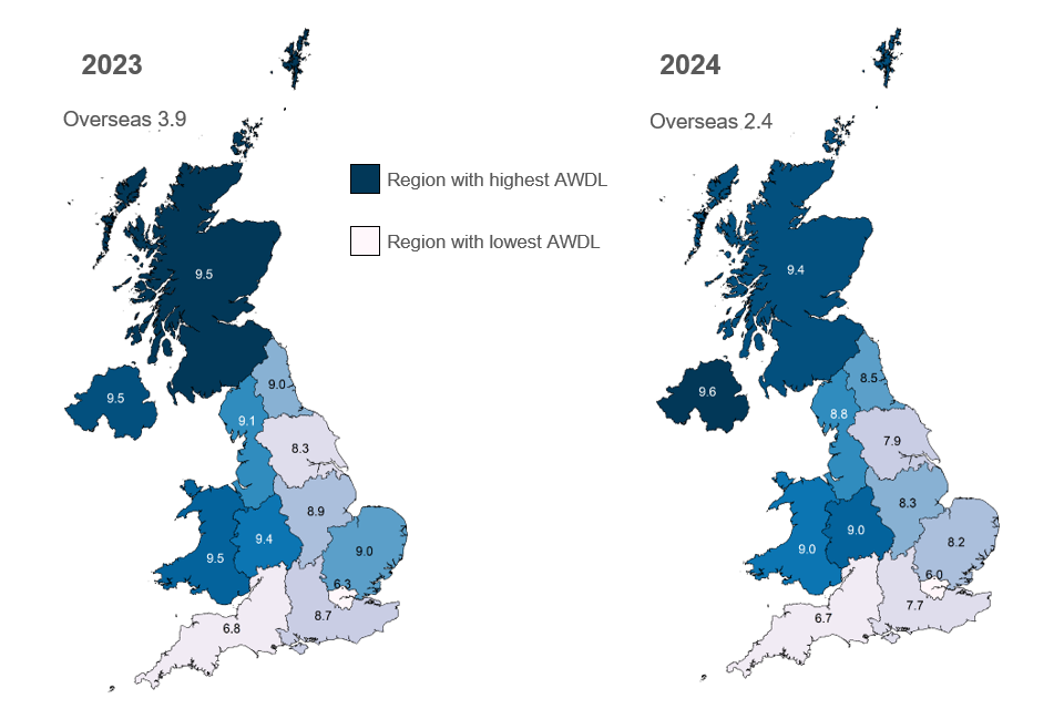 Home Office; AWDL decreased to 6.6 days in the year ending 31 March 2024 from 7.3 in the year ending 31 March 2023.