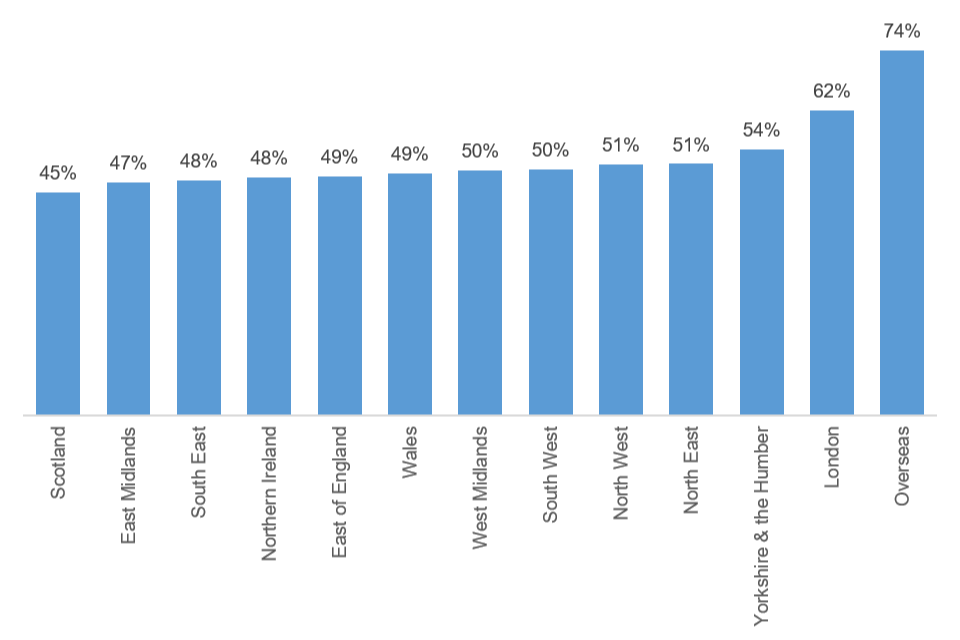 There is also variation in the percentage of staff with no reported sickness absence: after overseas (74%), this ranges from 62% in London to 45% in Scotland.