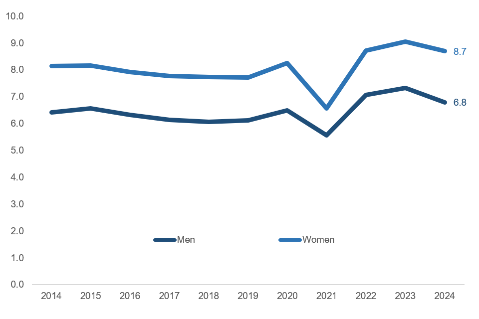 Figure 6.1: Average working days lost per staff year by sex, 2014 to 2024 (see Table 9)