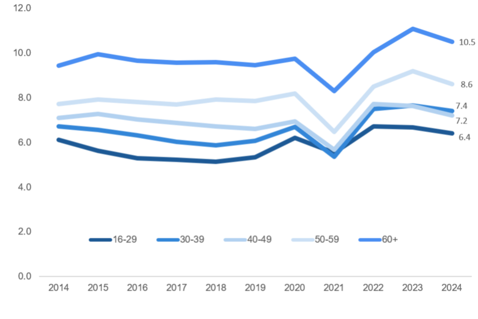 Figure 7.1: Average working days lost per staff year by age, 2014 to 2024 (see Table 12)