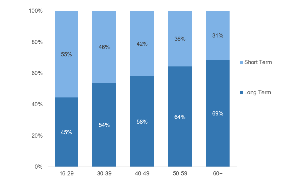 The percentage of absence that is long term also increases with age, from 45% in the under thirties to 69% in the over sixties.