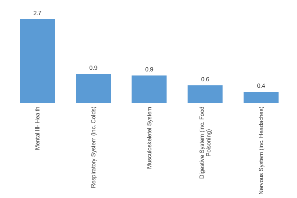 Mental Ill-Health was the leading cause of sickness absence, with an average of 2.7 days lost during the year. 0.3 days were lost on average to COVID-19.