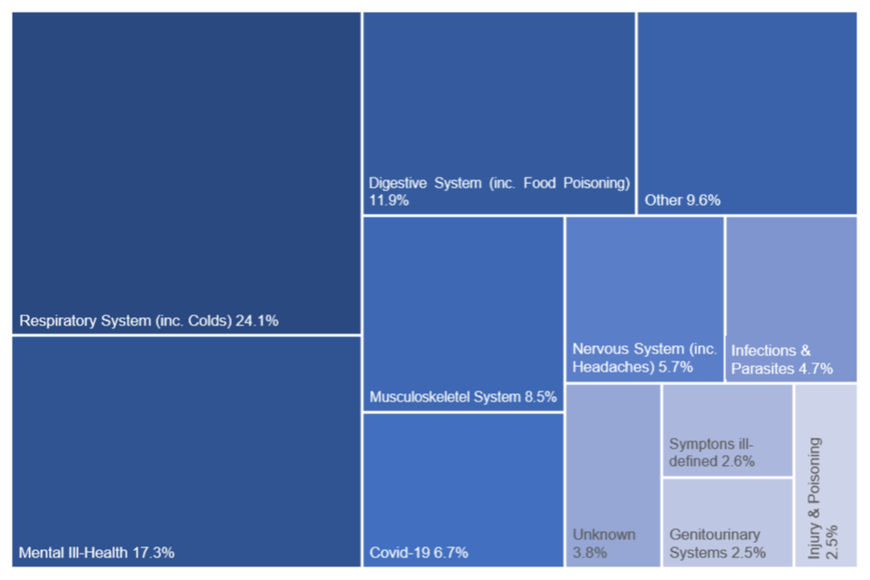 Respiratory System illnesses were the largest cause of short term absence (24.1%) followed by Mental Ill-health (17.3%).