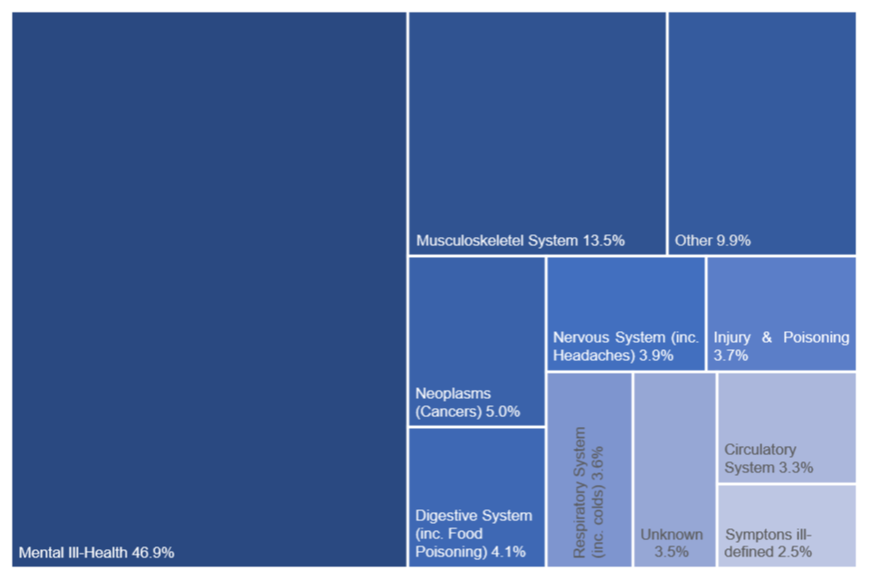 Mental Ill-Health was the largest cause of long term sickness absence (46.9%), followed by Musculoskeletal System Disorders (13.5%).