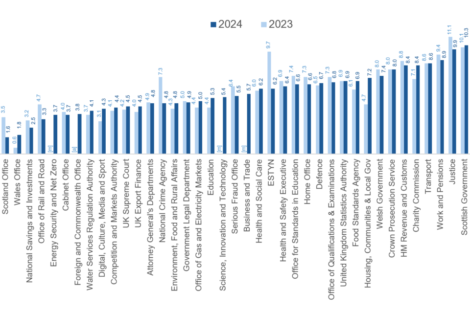 Average Working Days Lost (AWDL) per staff year by organisation ranges from 1.6 days at the Scotland Office to 10.3 days at the Scottish Government. Sickness absence decreased in just under half of the organisations (seventeen) between 2023 and 2024, including among others: