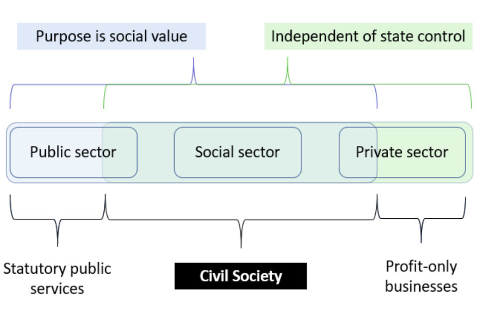 This definition includes the social sector of volunteers, charities and social enterprises. It excludes a lot of private sector and public sector activity - the private sector work for which the governing purpose is to deliver profits for owners, for example, or the public sector work delivered solely with statutory resources. But it includes parts of those sectors, as the following graphic illustrates: