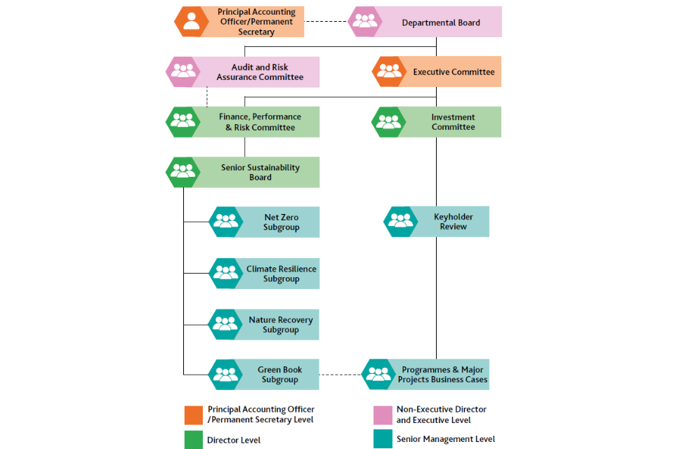 - The Executive Committee is supported by the director level Finance, Performance & Risk Committee and Senior Sustainability Board, and the senior management level Net Zero Subgroup, Climate Resilience Subgroup, Nature Recovery subgroup, and Green Book Subgroup.