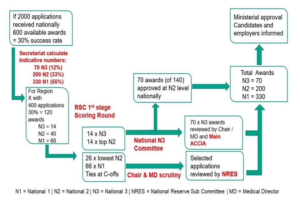 Then all the available National 1 awards and the top proportion of National 2 awards will go to the National N3 Committee for scrutiny. Meanwhile the lowest National 2 awards and all National 1 awards will be sent for scrutiny by the chair and medical director.