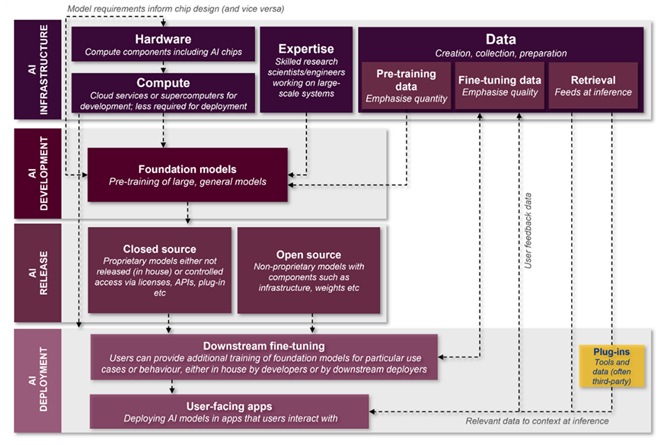In 2022, our horizon scanning highlighted AI foundation models (FMs) as an important emerging technology and possible driver of competition and consumer risks.[footnote 2] This led to our commencement of an extensive programme of research into and market monitoring of FMs and their possible impact on competition and consumer protection, as well as a significant programme of engagement with industry, civil society, academia and ongoing engagement with UK and international regulators. Our work on FMs has allowed us to develop a rich understanding of how FM markets work, and the current and possible future implications for competition and consumer protection. Our work on FMs has included an initial report published in September 2023 (in summary, short and full versions), as well as an April 2024 update paper and technical update report.[footnote 3] Figure one, taken from our recent foundation models update and technical reports, highlights the complex foundation model value chain that AI-powered services are built upon.