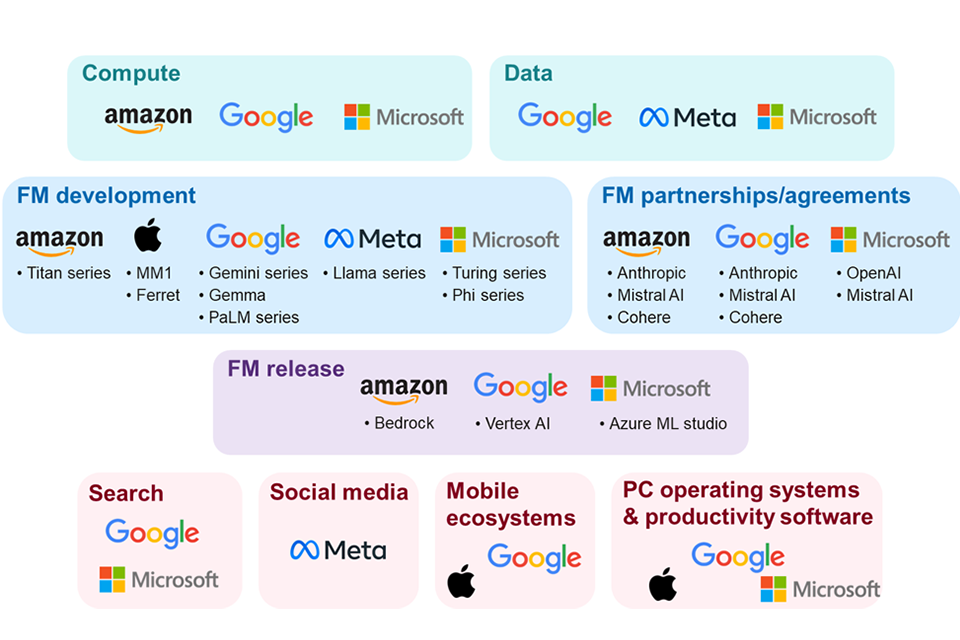 Some of these incumbent firms have strong upstream positions in one or more critical inputs for FM development as well as control over key access points or routes to market for FM services (including downstream AI-powered applications). They may also have market power in other digital markets which may be threatened by disruption and innovation from AI. This combination could mean that these incumbents have both the ability and incentive to shape the development of FM-related markets in their own interests, which could allow them both to protect existing market power and to extend it into new areas. Figure 2 below shows how some of those large tech firms are active across different levels of the FM value chain to varying degrees.