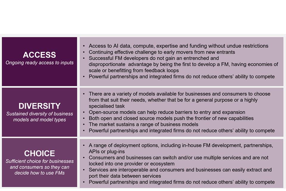 (1) Access: Ongoing ready access to inputs. Access to AI data, compute, expertise and funding without undue restrictions. Continuing effective challenge to early movers from new entrants. Successful FM developers do not gain an entrenched and disproportionate advantage by being the first to develop a FM, having economies of scale or benefitting from feedback loops. Powerful partnerships and integrated firms do not reduce others’ ability to compete.