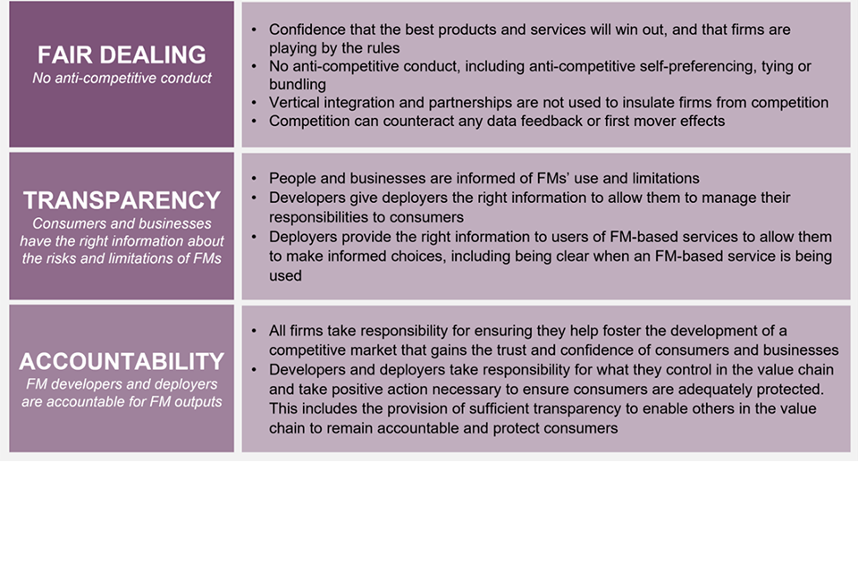 In our initial FM review in September 2023, we considered potential impacts on competition and consumer protection and proposed a set of principles to guide the sector towards positive outcomes in both areas. Given the range of developments across the FM ecosystem, and our deepened understanding of the sector through our own research and continued engagement with stakeholders, we have updated our CMA AI principles to guide the ongoing development and use of FMs and ensure that competition and consumer protection remains effective. These principles also apply to the downstream impact of FM-powered AI services.