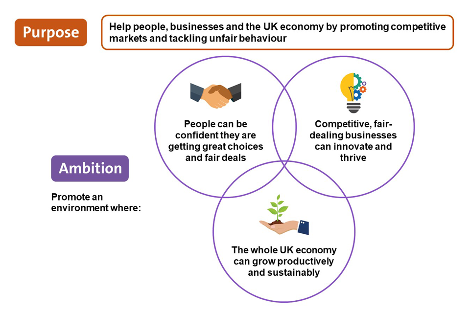 Image description: Figure detailing the CMA’s purpose and ambition. Text reads: Purpose, Help people, businesses and the UK economy by promoting competitive markets and tackling unfair behaviour. Diagram Ambition, Promote an environment where: people can be sure they are getting great choices and fair deals competitive, fair-dealing businesses can innovate and thrive the whole UK economy can grow productively and sustainably