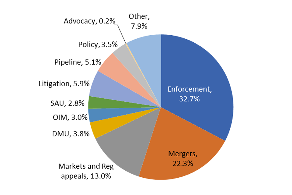 Figure 6 image description: A pie chart showing the distribution of staff time from January 2022 to December 2022 Enforcement 32.7% Mergers 22.3% Markets and Reg Appeals 13.0% DMU 3.8% OIM 3.0% SAU 2.8% Litigation 5.9% Pipeline 5.1% Policy 3.5% Advocacy 0.2% Other 7.9%