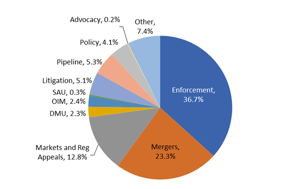 Figure 5 image description: A pie chart showing the distribution of staff time from January 2021 to December 2021 Enforcement 36.7% Mergers 23.3% Markets and Reg Appeals 12.8% DMU 2.3% OIM 2.4% SAU 0.3% Litigation 5.1% Pipeline 5.3% Policy 4.1% Advocacy 0.3% Other 7.4%