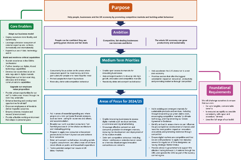 We have carefully considered which elements of our medium-term strategy should be updated for 2024 to 25. The CMA’s overarching purpose to help people, businesses and the UK economy by promoting competitive markets and tackling unfair behaviour remains the same, as does our ambition in terms of the outcomes we seek to achieve for people, businesses and the UK economy over the medium and long-term. Our foundational requirements, which inform decisions about when and how to act to ensure they deliver tangible benefits as rapidly as possible and using the full range of our toolkit, remain as relevant as last year, and are also unchanged. More information on our purpose is set out in section 3, our ambition in section 4, and our foundational requirements in section 5.
